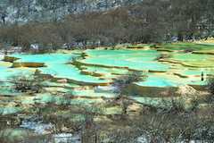 黄龍風景区は、中国四川省アバ・チベット族チャン族自治州の景勝地で、絶滅危惧種ジャイアントパンダ等の貴重な生息地でもあります。石灰岩層が氷河に侵食されて巨大な峡谷となり、そこに石灰分の豊富な水が流れ続けた結果、石灰華の沈殿したエメラルドグリーンの石灰華段(石灰華段丘とも)や滝や谷が形成されたカルスト地形が生んだ景観が見事です。