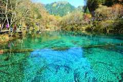 九寨溝は、中国四川省北部のアバ・チベット族チャン族自治州にある自然保護区で、標高2000-3400mに大小100以上の沼が連なるカルスト地形の淡水の湖水地帯です。水は透明度が高く、山から流れてきた石灰岩の成分(炭酸カルシウム)が沈殿し、日中には青、夕方にはオレンジなど独特の色を放ちます。運ばれてきた腐植物が石灰分に固定されて植物が生え、独特の景観を見せます。