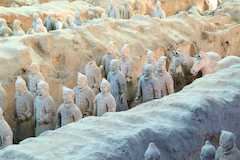 秦始皇帝陵は、紀元前246年から紀元前208年に造られたと推定されてます。1974年、地元の住民に兵馬俑が発見されました。3つの兵馬俑坑には戦車 約100台、陶馬600体、武士俑 約8000体あり、みな戦闘態勢で東を向いています。兵馬俑を建設したのは二代皇帝胡亥という説もあります。