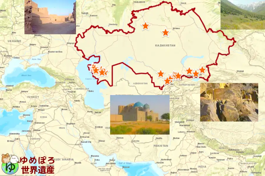 カザフスタンの世界遺産地図や行き方、全6件一覧と暫定候補。アクセス難易度・動画・写真・登録年・種類別も掲載。各国や日本の世界遺産一覧もあり。