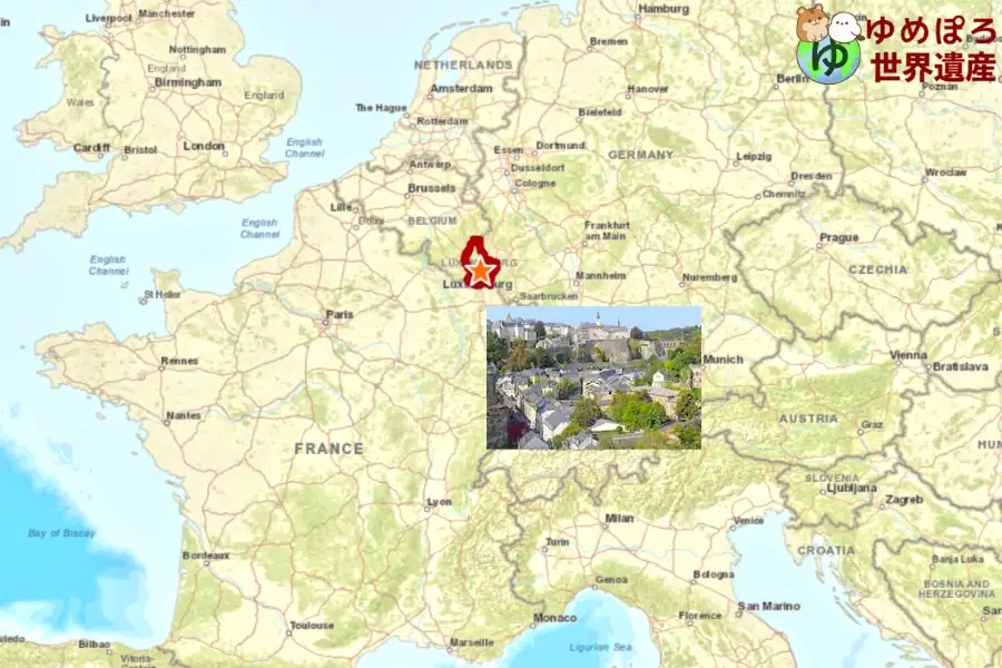 ルクセンブルクの世界遺産地図や行き方、全1件一覧と暫定候補。アクセス難易度・動画・写真・登録年・種類別も掲載。各国や日本の世界遺産一覧もあり。